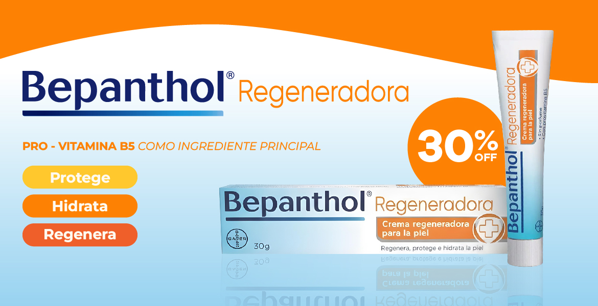 Precio rebajado 30% OFF Eliminar de lista Favoritos BEPANTHOL Crema Bepanthol Regeneradora Con Pro-Vitamina B5 X30gr Precio $ 7.581,70 Precio regular $ 10.831,00 Precio sin impuestos nacionales: $6265.87 Agregar al carrito