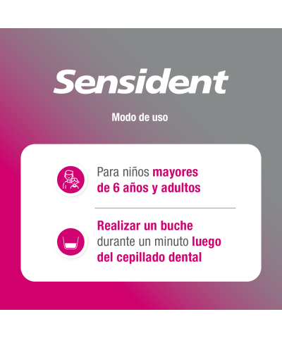 Adultos y niños mayores de 6 años colocar 10 ml de Sensident enjuague bucal en el vaso dosificador y efectuar enjuagues 2 o 3 veces por día durante un minuto luego del cepillado con Sensident pasta dental. Uso diario.