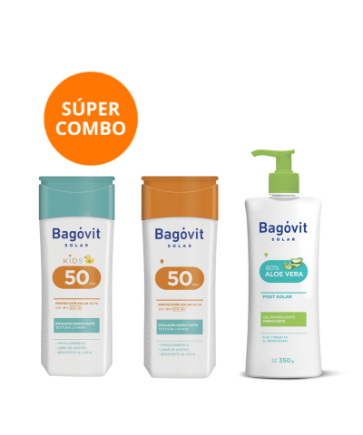 El Combo Incluye:Protector Solar Bagóvit Emulsión FPS 50+ X 200 Ml+Post Solar Bagóvit Gel Aloe Vera X 350 Ml+Protector Solar Bagóvit Emulsión Kids FPS 50+ X 200 Ml