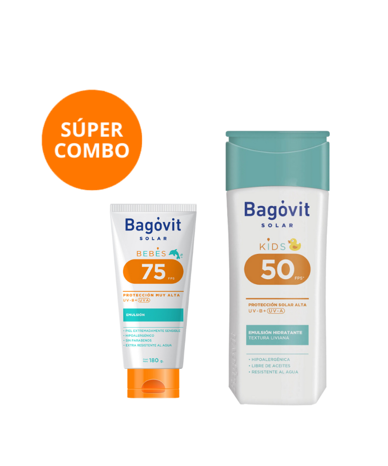 El Combo Incluye:Protector Solar Bagóvit Emulsión Kids FPS 50+ X 200 Ml+Protector Solar Bagóvit Emulsión FPS 75+ X 180 Ml