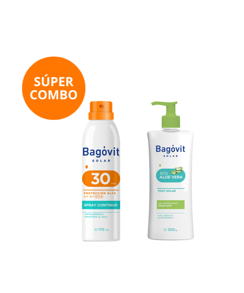 El Combo Incluye:Protector Solar Bagóvit Spray Continuo FPS 30+ X 170 Ml + Post Solar Bagóvit Gel Aloe Vera X 350 Ml