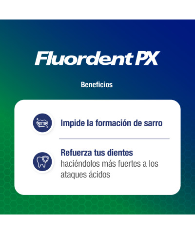 Fluordent PX Es La Pasta Dental De Elección De Los Especialistas. Su Triple Formulación Previene Las Caries, Impide La Formación De Sarro Y Refuerza Tus Dientes Haciéndolos Más Resistentes A Los Ataques ácidos. Sabor Menta