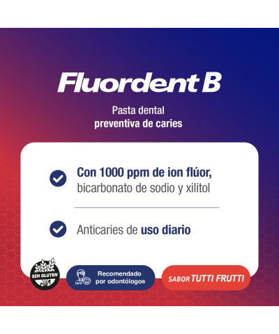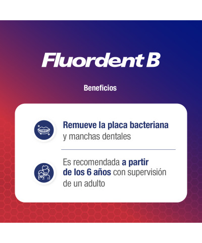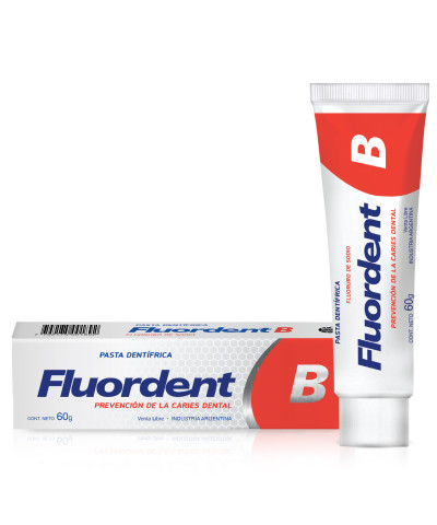 Fluordent B es una pasta dental con flúor recomendada para la prevención de caries, remoción de la placa bacteriana y manchas dentales.