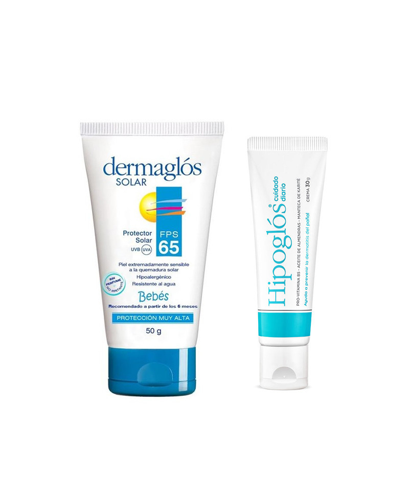 Crema Hipoglós Cuidado Diario x 30 g. Descripción: La pomada Hipoglós Cuidado Diario posee acción cicatrizante y regeneradora de los tejidos gracias a la acción de la vitamina A. Por otra parte disminuye las manifestaciones inflamatorias gracias al óxido de Zinc y es antiséptica, bacteriostática y anticandidiásica local por el aporte del Ácido Bórico. Protector Solar Dermaglós Bebés Fps 65 x 50 g. Descripción: Especialmente diseñado para la piel delicada del bebé. Protege tu piel y todo lo que haces bajo el sol. Resistente al agua, sin perfume, no irritante. Sin parabenos.Beneficios: Formulado con vitamina E otorga un efecto antioxidante y antiinflamatorio. La combinación de filtros solares, prevaleciendo los filtros físicos, poseen un bajo nivel de absorción en la piel con el fin de disminuir la probabilidad de irritación y/o alergias. Protege de las quemaduras y previene el envejecimiento prematuro de la piel producido por los rayos solares UVA/UVB. Recomendado a partir de 6 meses. Modo de uso: Aplicar abundantemente en el rostro y en el cuerpo 30 (treinta) minutos antes de la exposición al sol. La dosis adecuada para el cuerpo de un bebé de 6 meses hasta los a 3 años es 10 ml (equivalente a cubrir media palma de la mano de un adulto, o un mínimo de 3 cucharadas de té). Si la cantidad aplicada no es adecuada, el nivel de protección será significativamente reducido. Reaplicar cada 2 horas y luego de sudoración intensa, nadar o bañarse y/o secarse con toalla. Evitar el contacto con los ojos o mucosas. Uso externo. En niños menores de 6 (seis) meses de edad no se recomienda la exposición al sol ni el uso de protección solar. Consulte a su médico. No exponer a los bebés ni a los niños menores a un año directamente al sol. Proteja a los niños con gorro y remera. Evite la exposición prolongada de los niños al sol incluso si ha utilizado un producto de protección solar, ya que no les proporciona 100% de protección.