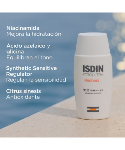 Es Un protector Solar Facial Especialmente Diseñado Para Piel Sensible Y Propensa A Las Rojeces. Su Fórmula De Textura Ligera Proporciona Una Alta Protección Contra Los Rayos UVB/UVA Y La Luz Visible, Al Tiempo Que Corrige Y Ayuda A Prevenir Las Rojeces De La Piel. También, Contribuye A calmar La Sensación De Irritación De Forma Inmediata. Este Fotoprotector Es Ideal Para El Cuidado De La Piel Sensible Y Reactiva Que Tiende A Enrojecerse. Ayuda A prevenir El Daño Solar Y Ofrece Una Alta Protección. Además De Su Función Protectora, Fotoultra Redness También corrige Y Reduce Visiblemente Las Rojeces De La Piel. Después De 14 Días De Uso, Se Observa Una Disminución Visible De Las Rojeces Y Una Mejora En Los Signos Asociados A La Piel Propensa A Manifestar Enrojecimiento. Con El Uso Continuado Durante 4 Semanas, Los Resultados Se Incrementan Aún Más. Contiene Ingredientes Antioxidantes Que Reducen El Estrés Oxidativo Causado Por La Radiación Solar. Con Niacinamida Que Fortalece La Función Barrera De La Piel Y Retiene La Humedad, Evitando La Deshidratación Y Reduciendo Los Signos De La Piel Propensa Al Enrojecimiento. El ácido Azelaico Y La Glicina Promueven Un Tono De Piel Equilibrado, Proporcionando Una Apariencia Más Brillante Y Luminosa. El Complejo Synthetic Sensitive Regulator, Con 4-T-Butylcyclohexanol Como Uno De Los Principales Componentes, Actúa Como Regulador De La Sensibilidad, Ayudando A Reducir La Reactividad De La Piel Y La Sensación De Irritación.